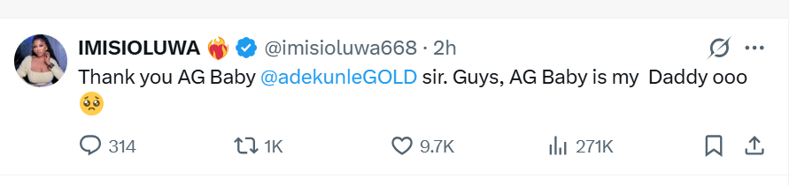 As Imisi continues to bask in her post-BBNaija spotlight, this gift from AG Baby stands as a symbol of gratitude, connection, and the sweet intersection of music and reality TV.